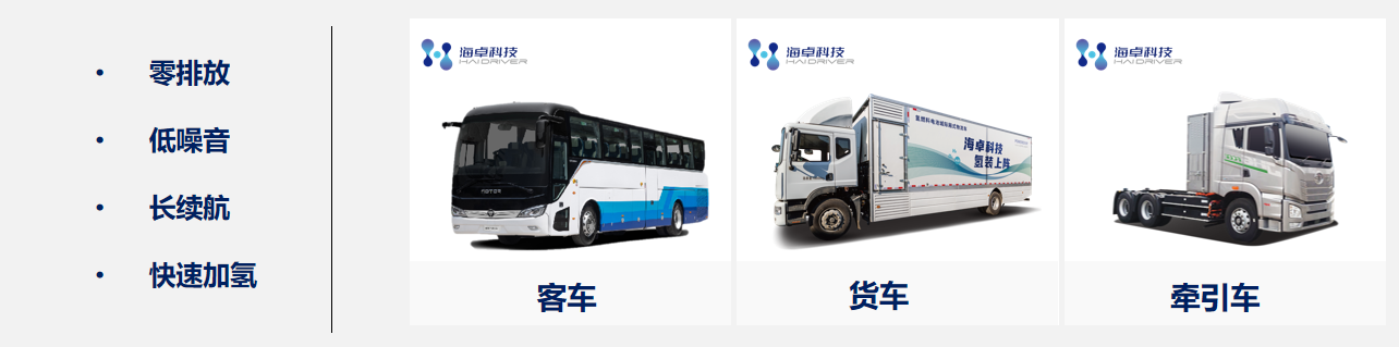 氢燃料电池车辆具有零排放的特点,相比于纯电,燃料电池技术具有长续航、动力足、高载重、加氢速度快等优势。新得利(中国)致力于为交通领域给予可靠、高效的燃料电池解决方案。在车载应用领域,已为700余辆燃料电池汽车给予动力支持,覆盖物流车、自卸车、牵引车、公交车等多个车型,并在全国多地投入运营。